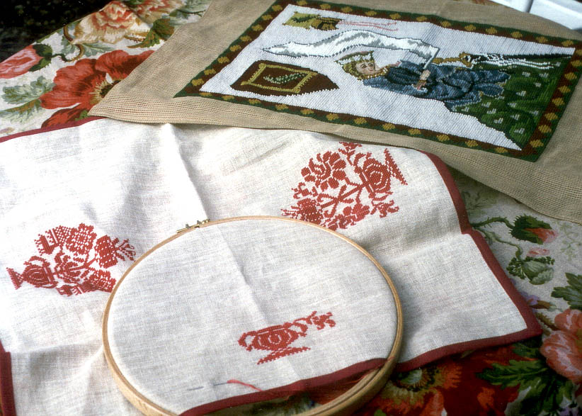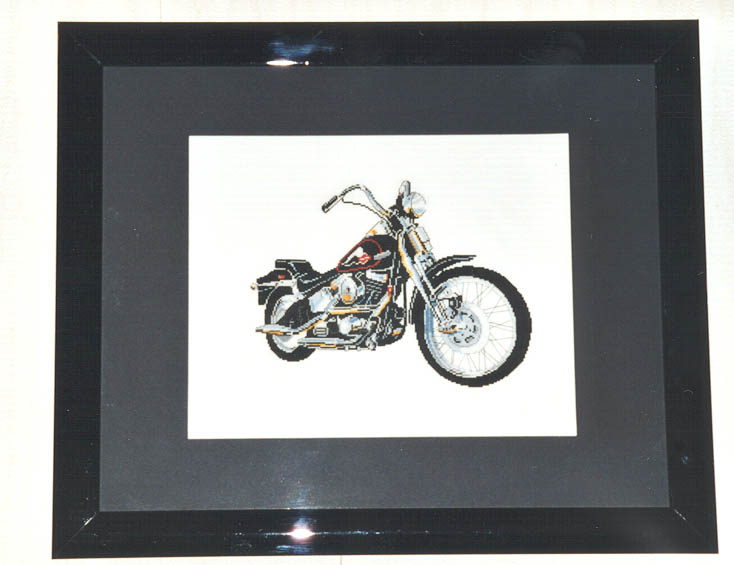 Hier sehen Sie einige Kreuzstichbilder, die ich allerdings nach Vorlagen gearbeitet habe. Kreuzstichbilder kann man nicht durch Vorzeichnungen umsetzen, da der Stoff meistens nicht vollständig überstickt wird. Sehr schöne Vorlagen erhält man über das Internet bei Monika Arnold. Daher habe ich die Vorlage zu dem Motorrad bezogen.