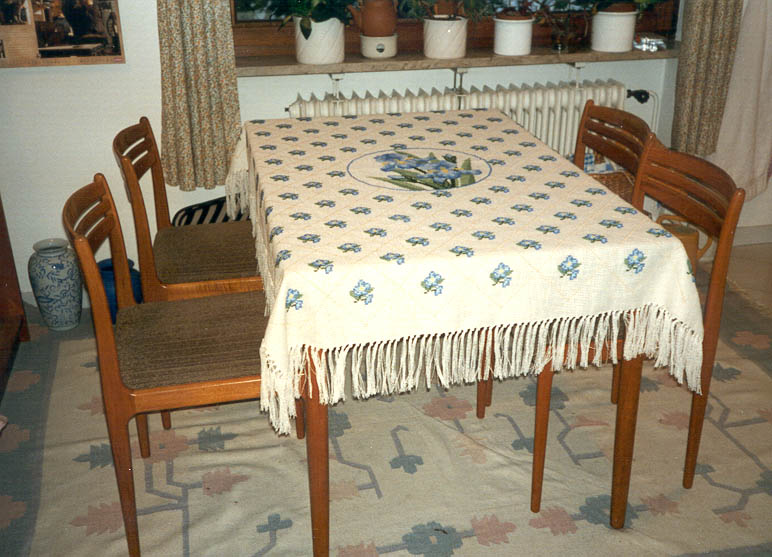 Eine Tischdecke mit sehr grobem Stich: 2,5 pro cm. Ich fand die rustikale Wirkung sehr schön. Die Idee stammt aus einem Spanischen Stickheft. |